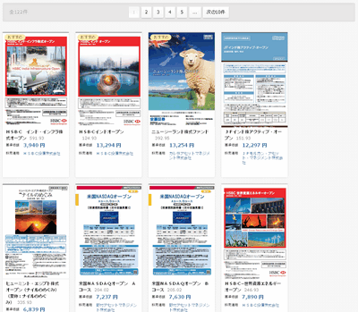 目論見書表紙の大きな画像をメインに表示します(1画面に10銘柄表示)。画像にマウスオンすると「詳しく見る」などのボタンが表示されます。