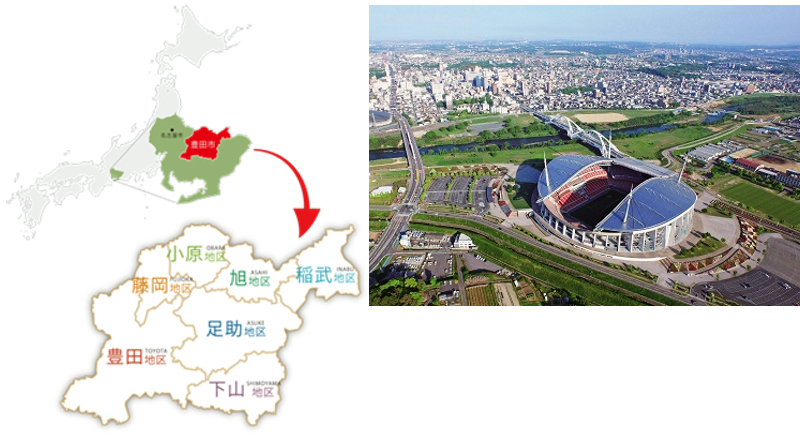 豊田市は愛知県のほぼ中央に位置し、愛知県全体の17.8%を占める広大な面積を持つ町です。全国有数の製造品出荷額を誇る「クルマのまち」として知られ、世界をリードするものづくり中枢都市としての顔を持つ一方、市域のおよそ7割を占める豊かな森林、市域を貫く矢作川、季節の野菜や果物を実らせる田園が広がる、恵み多き緑の町としての顔を併せ持っています。