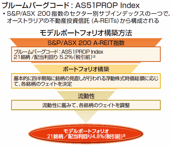 〔オーストラリアリート投資〕 主としてオーストラリアの金融商品取引所に上場している不動産投資信託受益証券(リート)等(以下「オーストラリアリート」といいます。)に投資することにより、安定した配当収入の確保と中長期的な値上がり益の獲得を目指して運用を行います。 オーストラリアリートの投資にあたっては、S&P/ASX 200 A-REIT指数の採用銘柄を参照して、運用を行います。ただし、当ファンドのパフォーマンスは、同一銘柄の不動産投資信託受益証券(リート)への投資割合は、当ファンドの純資産総額の10%以下とする投資制限およびスワップ取引の損益等の影響により、当該指数に直接連動することを目指したものではありません。 〔オーストラリアリートのコールオプションに関するスワップ取引〕 スワップ取引を通じて、実質的に当ファンドが保有するオーストラリアリートを対象としたオプション取引(コールオプションの売却)の損益に連動する投資成果を享受します。 当該スワップ取引の想定元本の額は、取得時において当ファンドが保有するオーストラリアリート評価額の概ね60%を上限とします。 〔通貨コールオプションに関するスワップ取引〕 スワップ取引を通じて、実質的にオーストラリアドル対円を対象としたオプション取引(コールオプションの売却)の損益に連動する投資成果を享受します。 当該スワップ取引の想定元本の額は、取得時において当ファンドが保有するオーストラリアドル建資産総額の概ね50%を上限とします。 ※資金動向や市況動向等によっては、上記のような運用ができない場合があります。 |